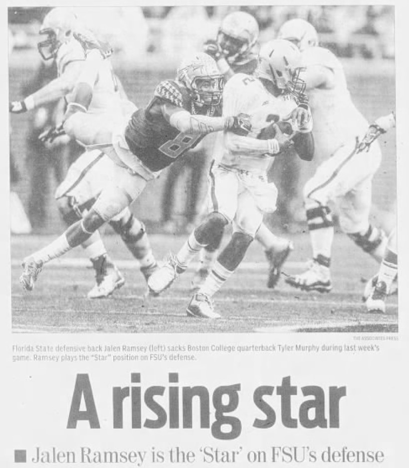 NoleSports.com's Natalie Pierre, before Ramsey's sophomore season: "This season is all about the details for Jalen Ramsey. After putting together a freshman All-American season last year, the versatile defensive back enters this season with an expanded role in Florida State's talent-filled secondary. In preparation for his sophomore campaign where he will play multiple positions, in addition to being a team leader for the reigning national champions, Ramsey has spent countless hours in the Seminoles' meeting rooms watching film of former FSU defensive back Lamarcus Joyner. Part of Ramsey's new role this season will include playing the star in the team's nickel package (five defensive backs) that they will use much of the time to attack opposing offenses."