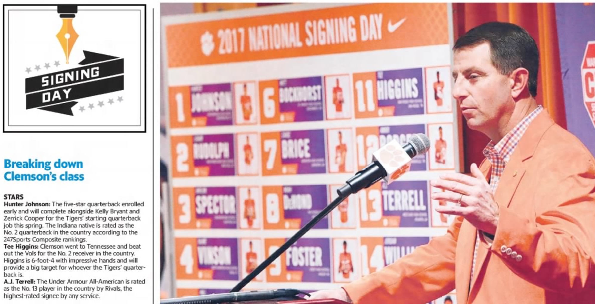 "Clemson went to Tennessee and beat out the Vols for the No. 2 receiver in the country," reported The State (above) on National Signing Day in February 2017. "Higgins is 6-foot-4 with impressive hands and will provide a big target for whoever the Tigers' quarterback is."