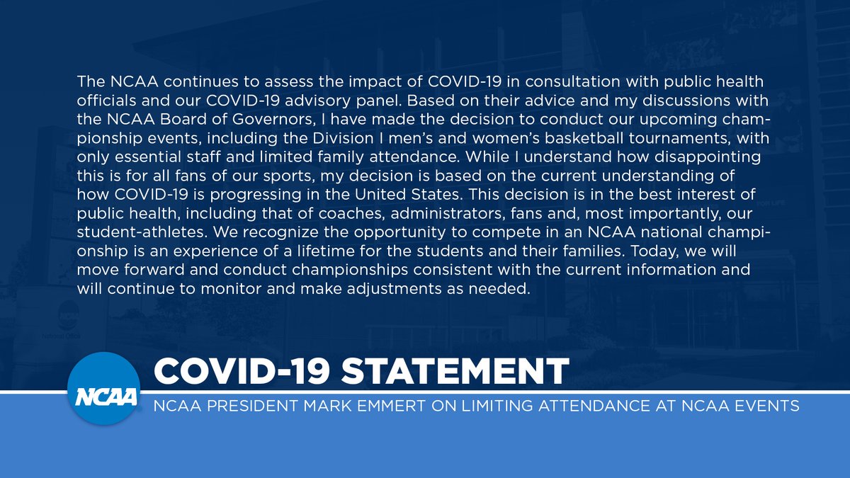 Today, NCAA President Mark Emmert and the Board of Governors canceled the Division I men’s and women’s 2020 basketball tournaments, as well as all remaining winter and spring NCAA championships. This decision is based on the evolving COVID-19 public health threat, our ability to ensure the events do not contribute to spread of the pandemic, and the impracticality of hosting such events at any time during this academic year given ongoing decisions by other entities.
