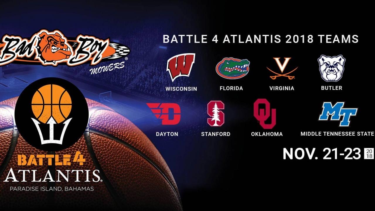 Six power conferences will be represented on Paradise Island, Bahamas, for the 2018 Battle 4 Atlantis. Villanova won the Battle 4 Atlantis last fall before cutting down the nets in April, so don't underestimate the value of early season tournaments. Butler, Dayton, Florida, Middle Tennessee State, Oklahoma, Stanford, Virginia and Wisconsin will compete in paradise in the three-day tournament.