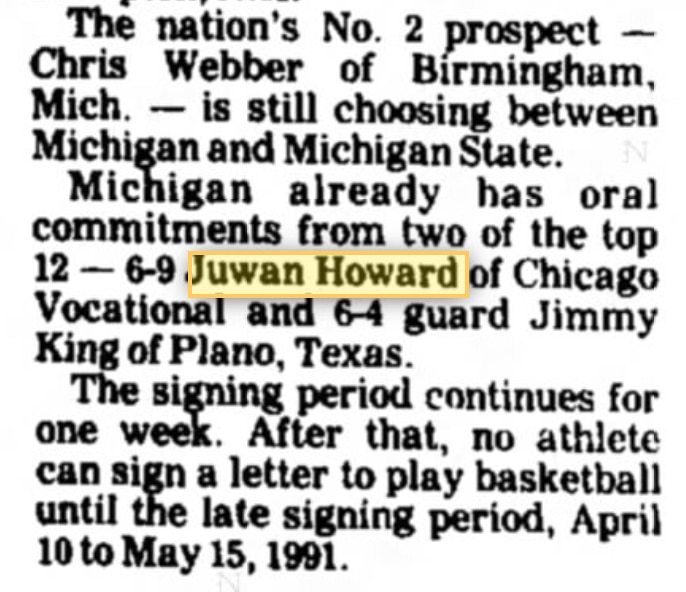 The Detroit Free Press' Mitch Albom wrote in April 1993, "Juwan Howard, all 6 feet 9 inches of his polite, grinning self, is in the middle of these remarkable Wolverines, who have gone from boys to men in front of the world. He is in the middle of it, but he is also at the start of it. He was the first to commit. The initial card in what many call the best recruiting hand in the history of college basketball."