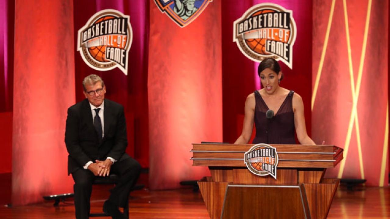 Former UConn star Rebecca Lobo references Geno Auriemma during her Hall of Fame induction speech.