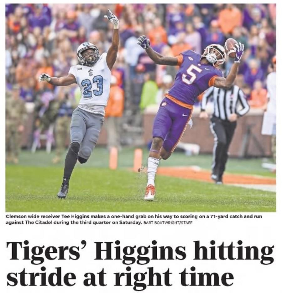 The Times and Democrat's Zach Lentz, in November 2019: "If there is one thing that the 52-3 domination of the Wake Forest Demon Deacons should tell future opponents, it's that a quiet Tee Higgins is a bad Tee Higgins. Bad for the opposing team that is. Before the Wake game, Higgins was not his normal self and co-offensive coordinator Tony Elliott was worried about him. But the people who should have been worried about Higgins were those on Wake Forest's defense."