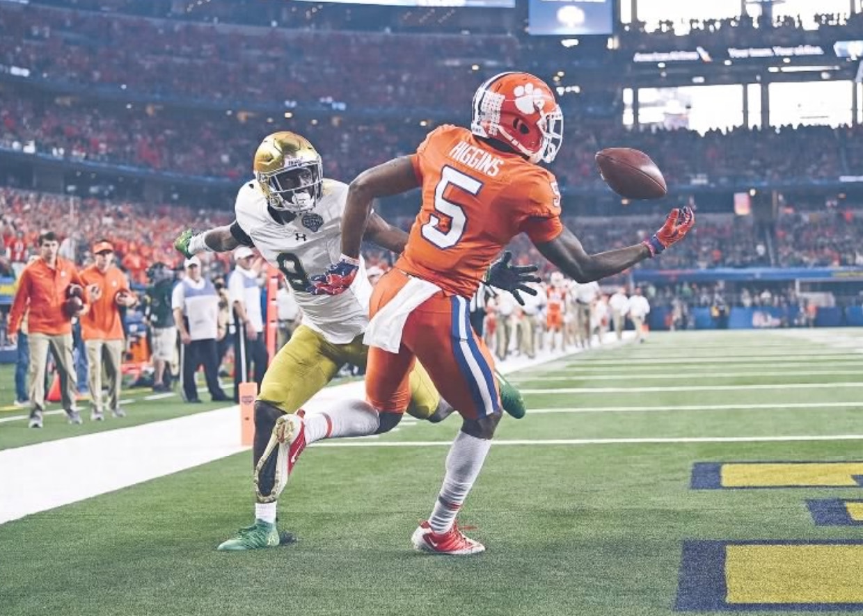 For the second time during his sophomore season, Higgins scored in four consecutive games, except the second four-game stretch included wins over rival South Carolina, Pitt in the ACC Championship Game, Notre Dame in the College Football Playoff semifinals and Alabama in the CFP National Championship.